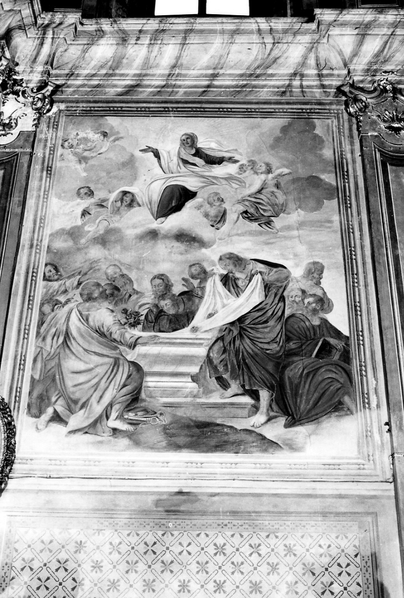 Soggetti sacri. Personaggi: Madonna. Figure: apostoli; angeli. Abbigliamento. Costruzioni: sepolcro. Piante: rose. Oggetti: telo; libro
