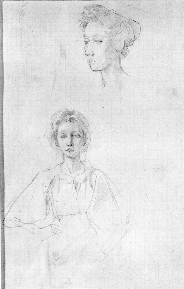 Nel registro inferiore, è lo studio di una giovane donna, descritta a mezza figura, con mani sui fianchi; nel registro superiore del disegno, è lo studio del volto, colto di profilo