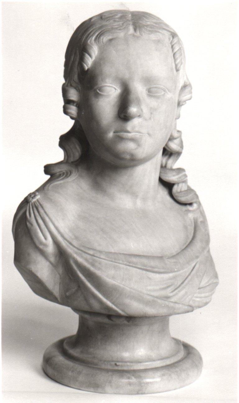 Su piedistallo a sezione circolare, ritratto di bambina, con veste dall'ampia scollatura e capelli sciolti sulle spalle