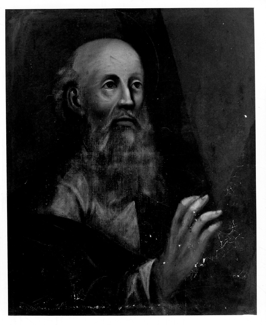 dipinto raffigurante San Giacomo a mezza figura rivolto verso destra, il volto di tre quarti, con il bastone nella mano destra, la barba e i capelli bianchi su sfondo scuro