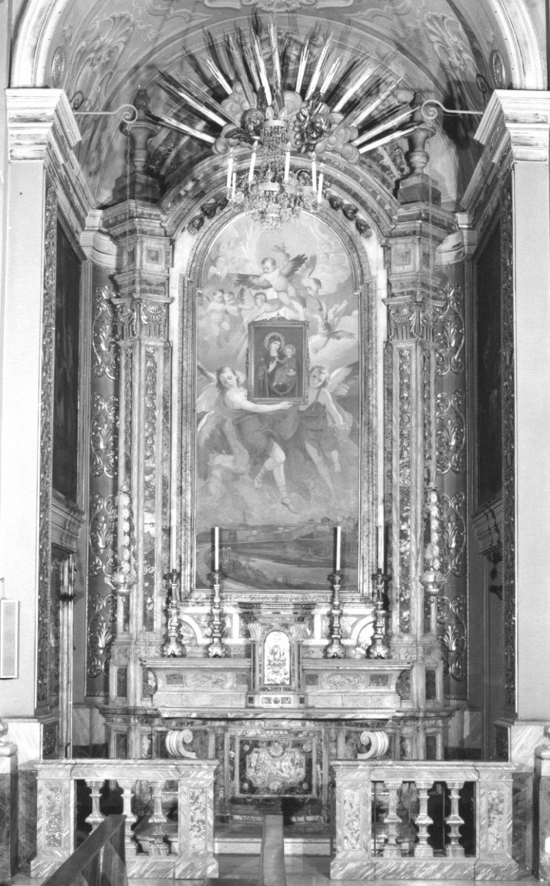 - NOTIZIE STORICO CRITICHE L'altare, intitolato originariamente a San Luigi Gonzaga e a San Vincenzo Ferreri, fu eretto tra il 1778 e il 1782 a spese della compagnia della dottrina cristiana. Il lavoro, iniziato dal capo mastro Carlo Giuseppe Perratone per la parte in laterizio e dal capomastro marmorista Amedeo Rizzo, che firmò nel 1778 il contratto, fu rilevato nel 1781 da Pietro Casabella del fu Carlo Ambrogio di Saltri, Stato di Milano, anch'egli "mastro marmorista". Collaborarono il minusiere Giovanni Battista Rossi per l'anta del tabernacolo, il telaio e la cornice del dipinto; l'indoratore Felice Gamna ed il serragliere Spingor. L'icona raffigurante "La S. Vergine col Bambino in bracio S.Luigi Gonzaga S.Filippo Nerij e S.Vincenzo Feraro" fu commissionata a Vittorio Amedeo Rapous, che ne ricevette il saldo nel 1782. Nel 1834 venne eretta allo stesso altare la compagnia della Beatissima Vergine Consolatrice e di San Luigi Gonzaga, che ne mutò in seguito l'intitolazione