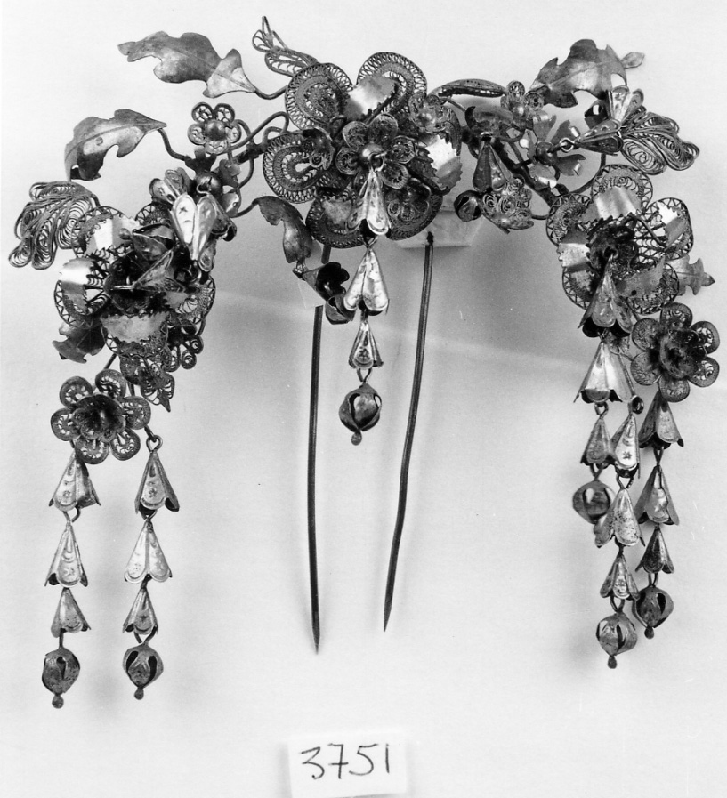 Monile da acconciatura, ornato centrale di "burletto" con doppio ago. E' a forma di mezzaluna con fiore centrale e foglie; 4 più piccoli ai lati. Al centro dei fiori e in basso pendono catenelle di campanule