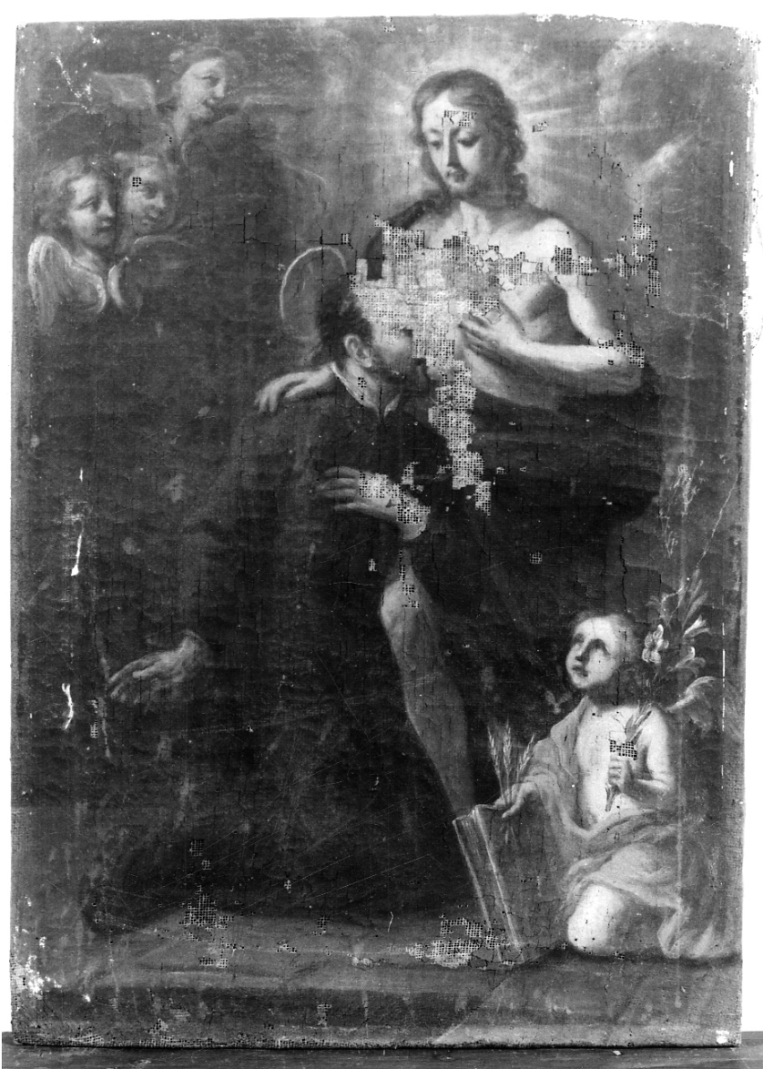 Il dipinto raffigura Sant'ignazio di Loyola inginocchiato ai piedi di Gesù, che gli pone una mano sulla spalla, mentre con l'altra gli mostra il Sacro Cuore. Vicino al Santo, pure inginocchiato, c'è un angioletto, che reca nelle mani un giglio ed un libro, attributi noti di Sant'Ignazio. In alto, s'intravedono delle teste cherubiniche