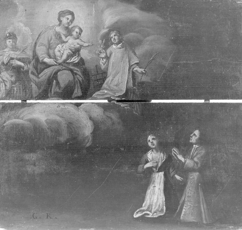 Soggetti sacri. Personaggi: Madonna; Gesù; S. Lorenzo; Santo. Figure: devoti. Abbigliamento