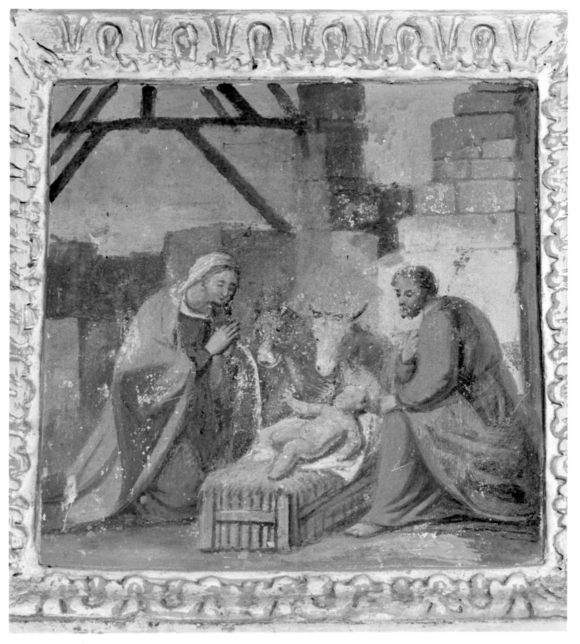 Soggetti sacri. Personaggi: Maria Vergine; San Giuseppe; Gesù Bambino. Abbigliamento. Oggetti. Animali: bue; asino. Interno