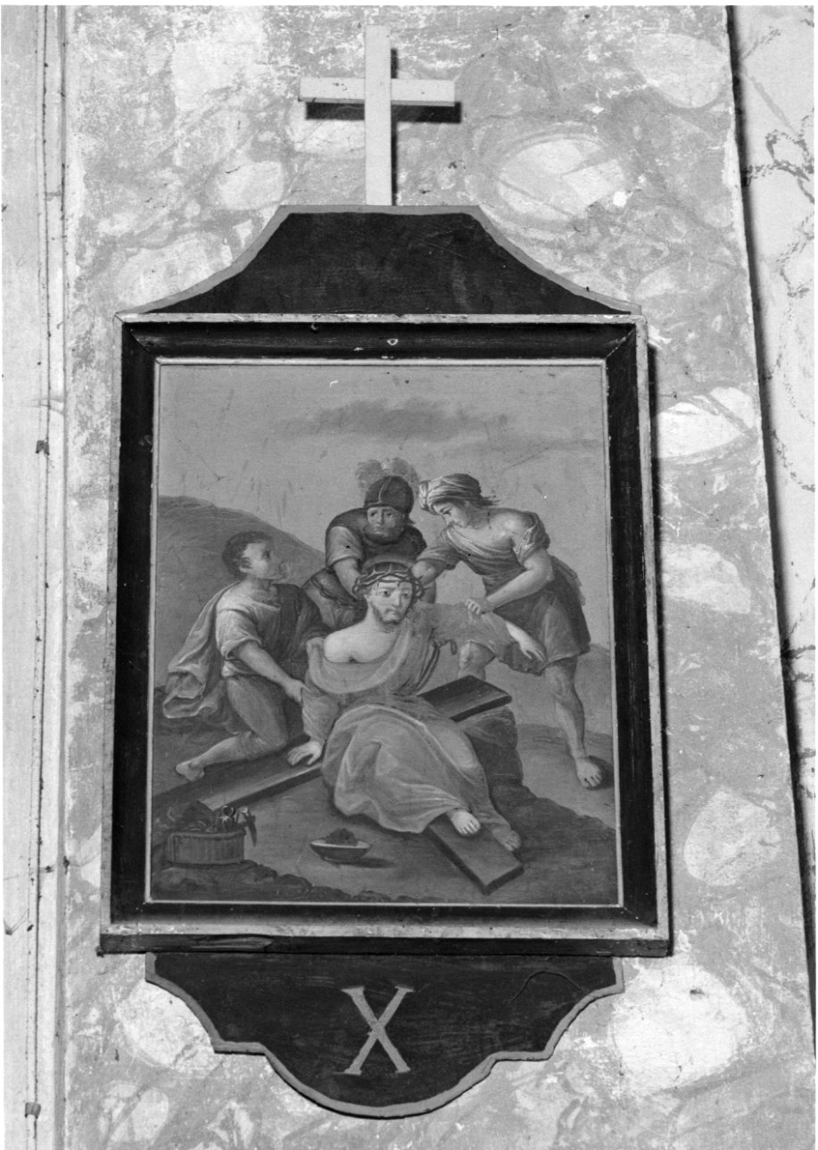 Gesù raffigurato seduto sopra la croce attorniato da tre carnefici in atto di strappargli la veste