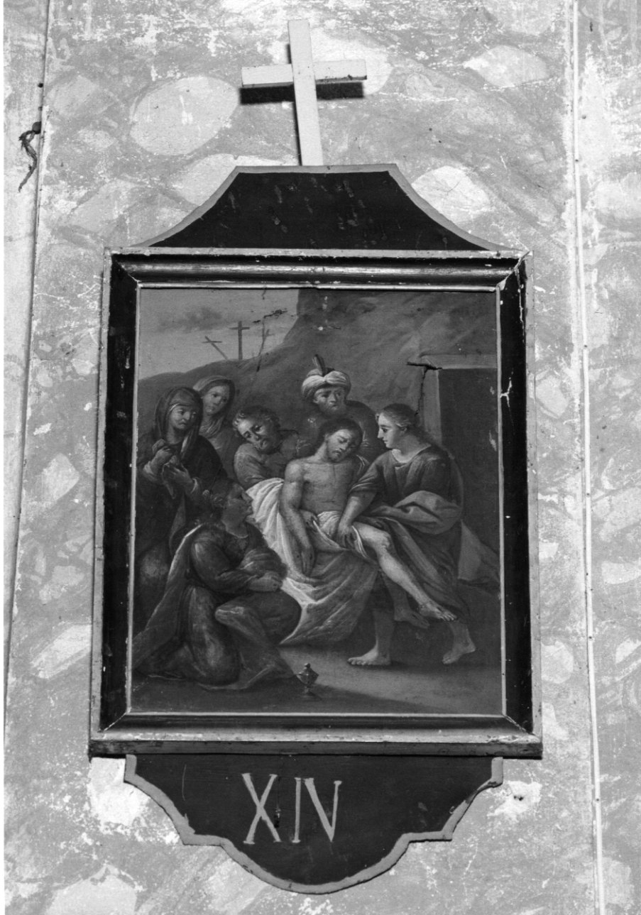 Cristo è trasportato all'ingresso del sepolcro da Nicodemo, San Giuseppe d'arimatea e altra figure maschile, mentre San Giovanni è inginocchiato davanti a lui e la Madonna con Maria Maddalena seguono la pietosa sepoltura. Compaiono all'orizzonte le tre croci
