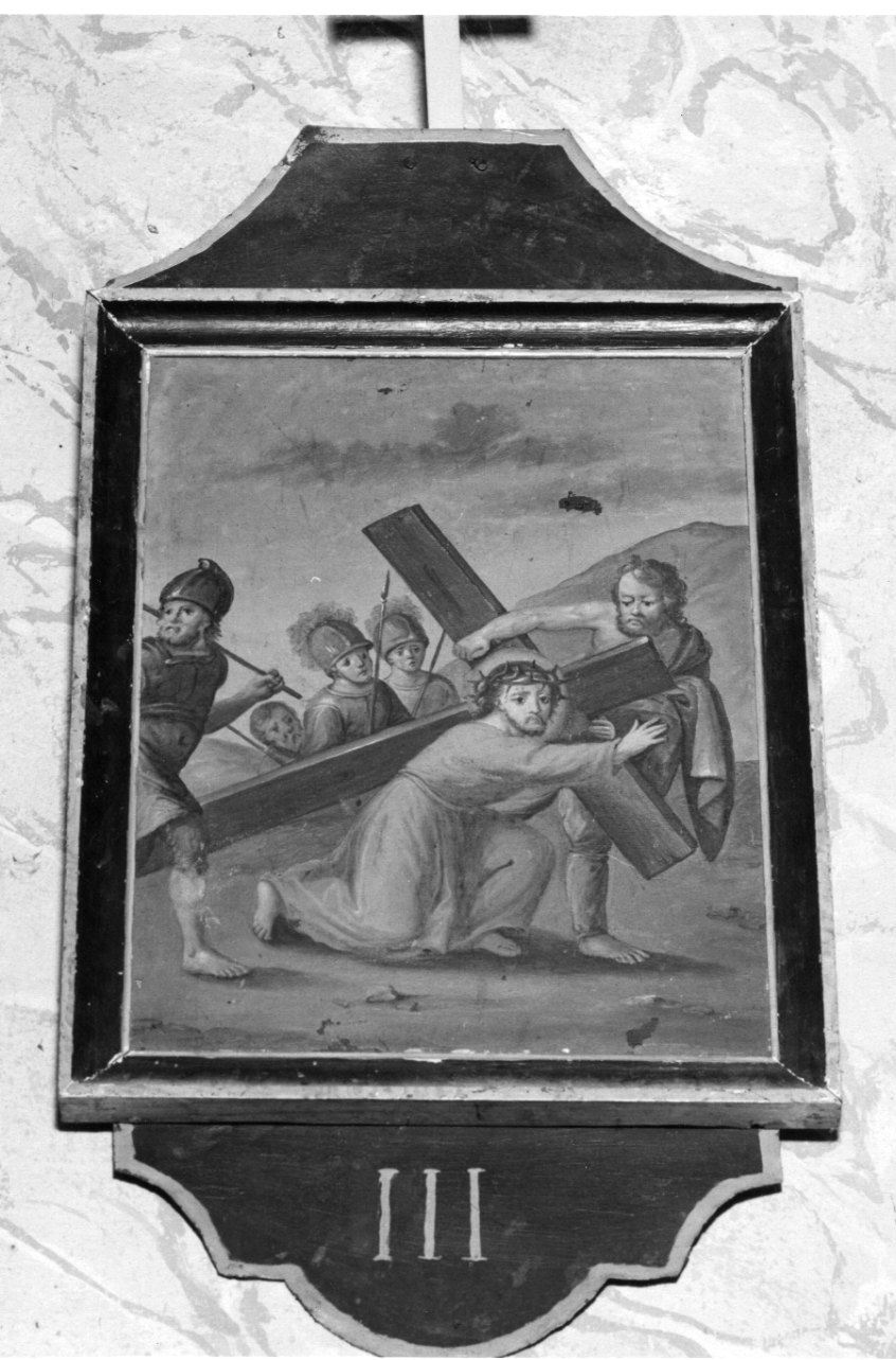 Gesù raffigurato in ginocchio gravato dal peso della croce, seguito nel cammino verso il Golgota dai soldati e da una figura maschile che lo aiuta a reggere la croce