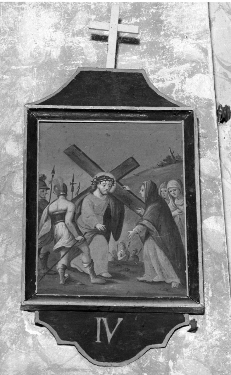 Gesù raffigurato in cammino con la croce sulla spalla e attorniato da soldati vede davanti a sè la madre, seguita da due pie donne