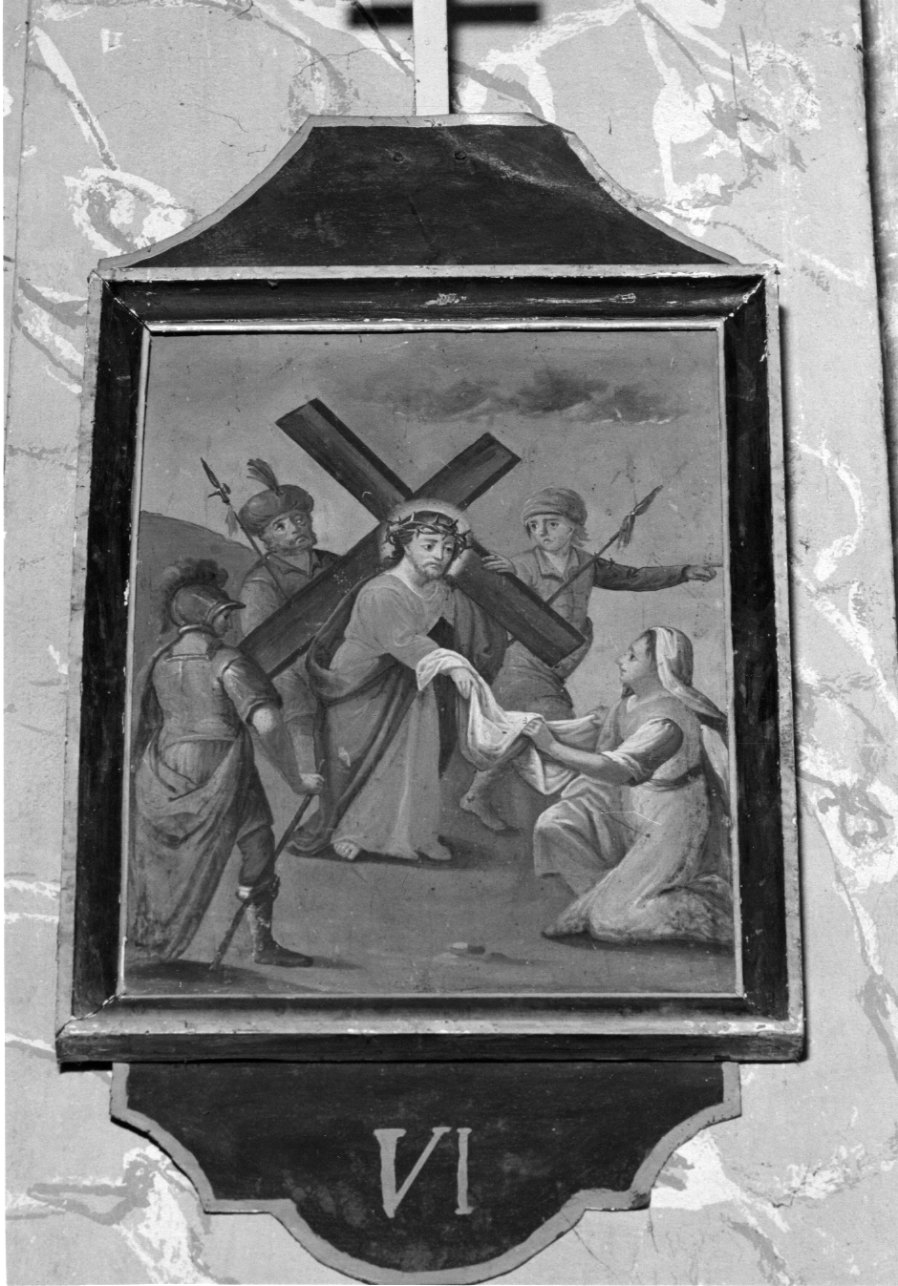 Gesù in cammino con la croce su una spalla, circondato dai suoi carnefici, prende un lembo del velo che la Veronica gli porge stando inginocchiata davanti a lui