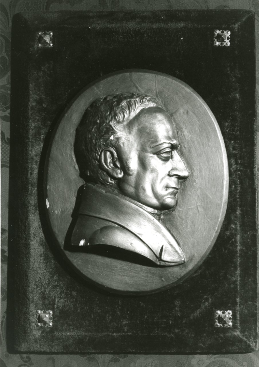Su fondo in velluto rosso, ovale in scagliola con il profilo di Silvio Pellico