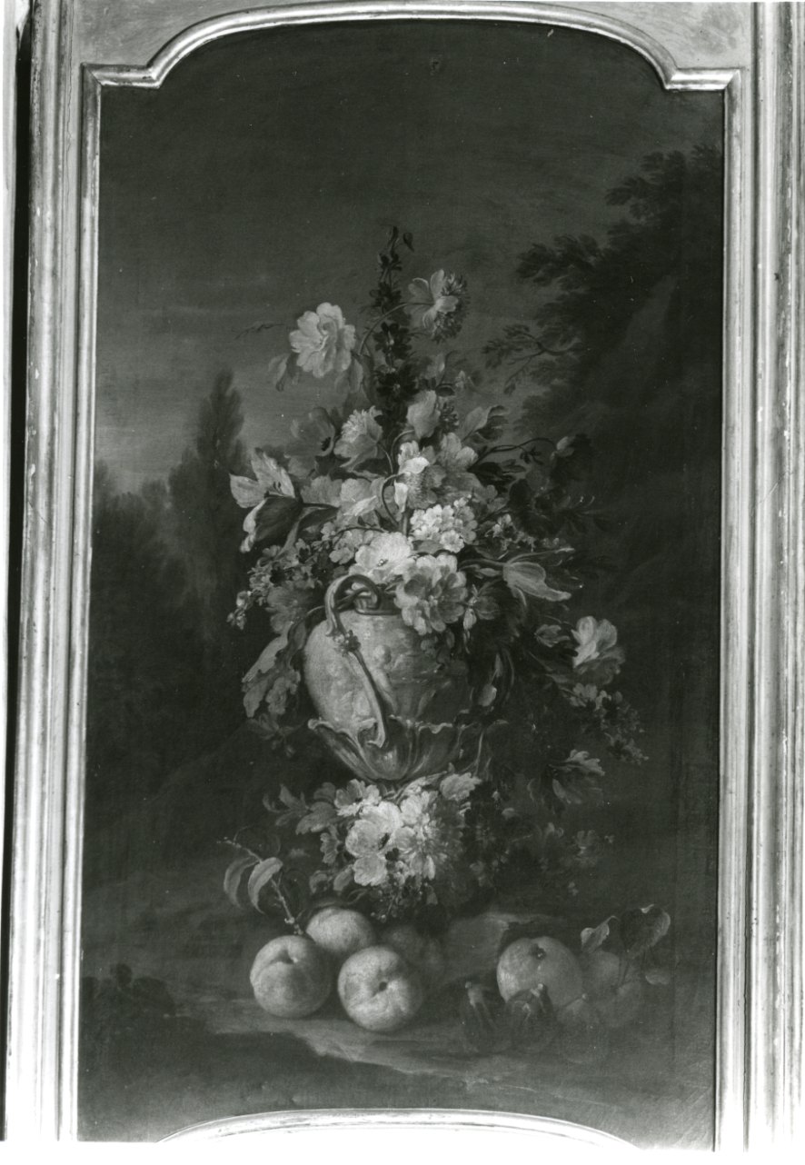 Entro cornice lievemente centinata, è un vaso colmo di fiori di diverse varietà; alcuni frutti si dipongono intern al piede. Sullo sfondo è un paesaggio