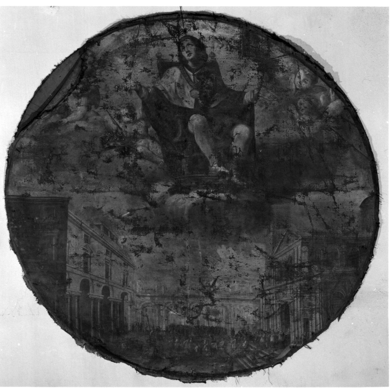 Beato Amedeo IX in gloria su trono tra cherubini che reggono a sinistra corona e scettro. Il dipinto è privo di cornice