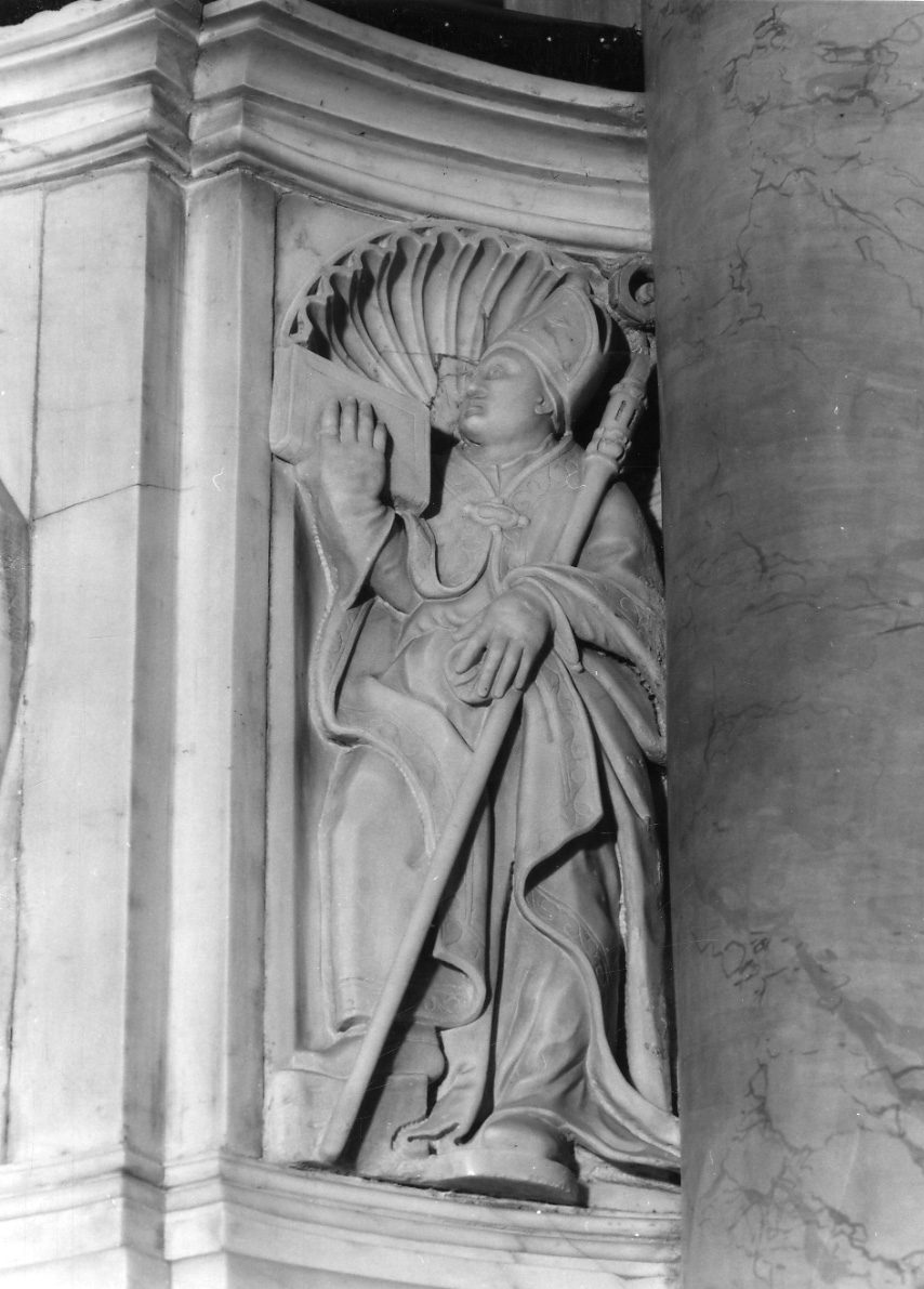 Rilievo marmoreo con santo vescovo forse S. Maggiorino scolpito entro uno spazio concavo concluso a conchiglia