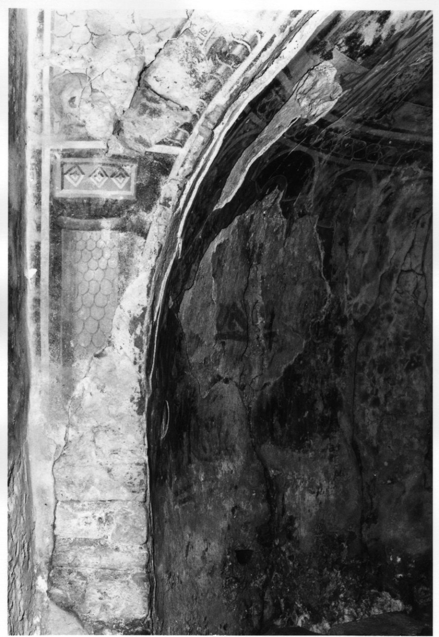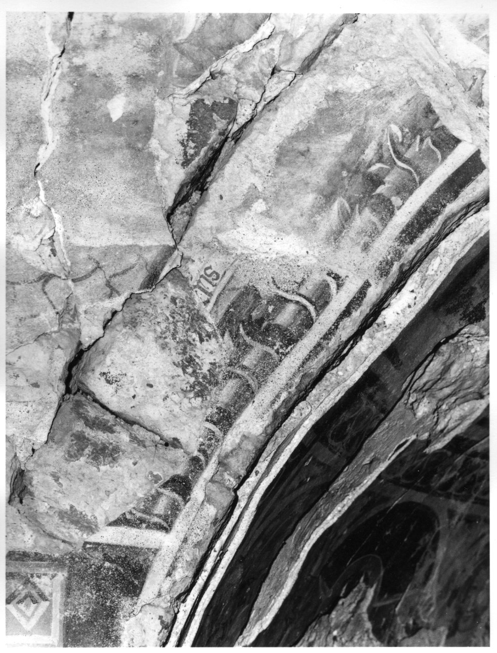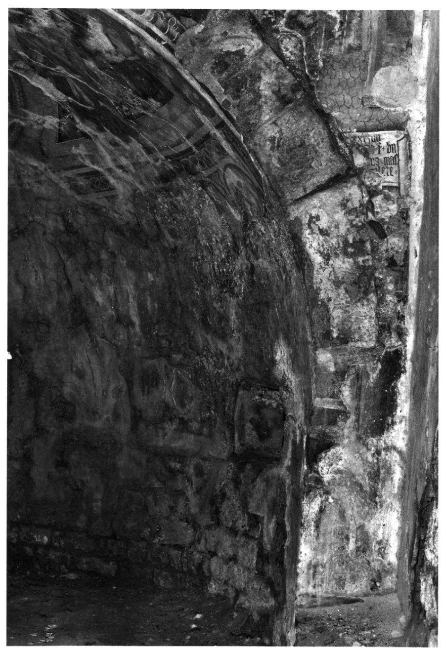 Il complesso decorativo comprende fasce con scritte gotiche e, nella fascia dell'arcone, decorazione a foglie