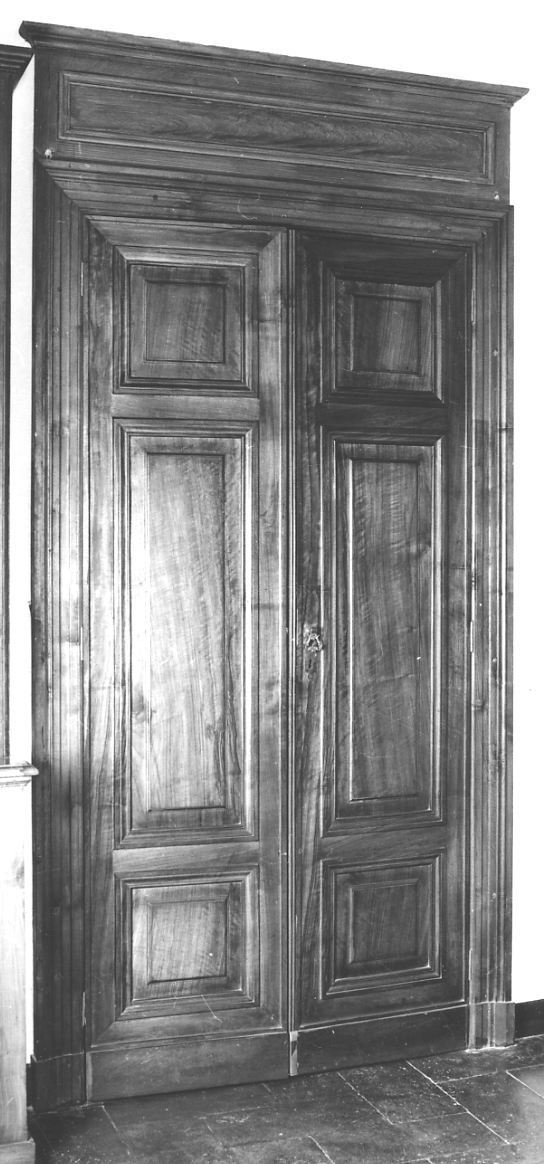 Armadio a muro a due ante. Anta: a tre specchiature. Cimasa lineare con profilatura interna rettangolare a rilievo. Mostrina metallica e maniglia a volute