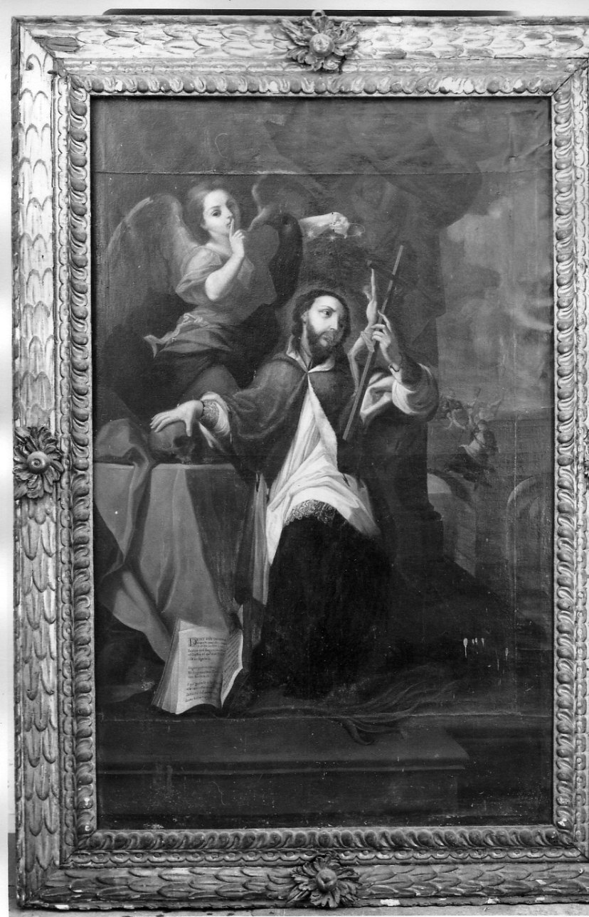 San Giovanni Nepomuceno, con la mano destra appoggiata sul teschio, volge lo sguardo in adorazione della croce. Dietro di lui, un angelo gli porge sul capo un'aureola, invintando al silenzio lo spettatore. Sul fondo, a destra, la scena del suo martirio; il santo viene gettato giù dal ponte di Praga, con piedi e mani legate