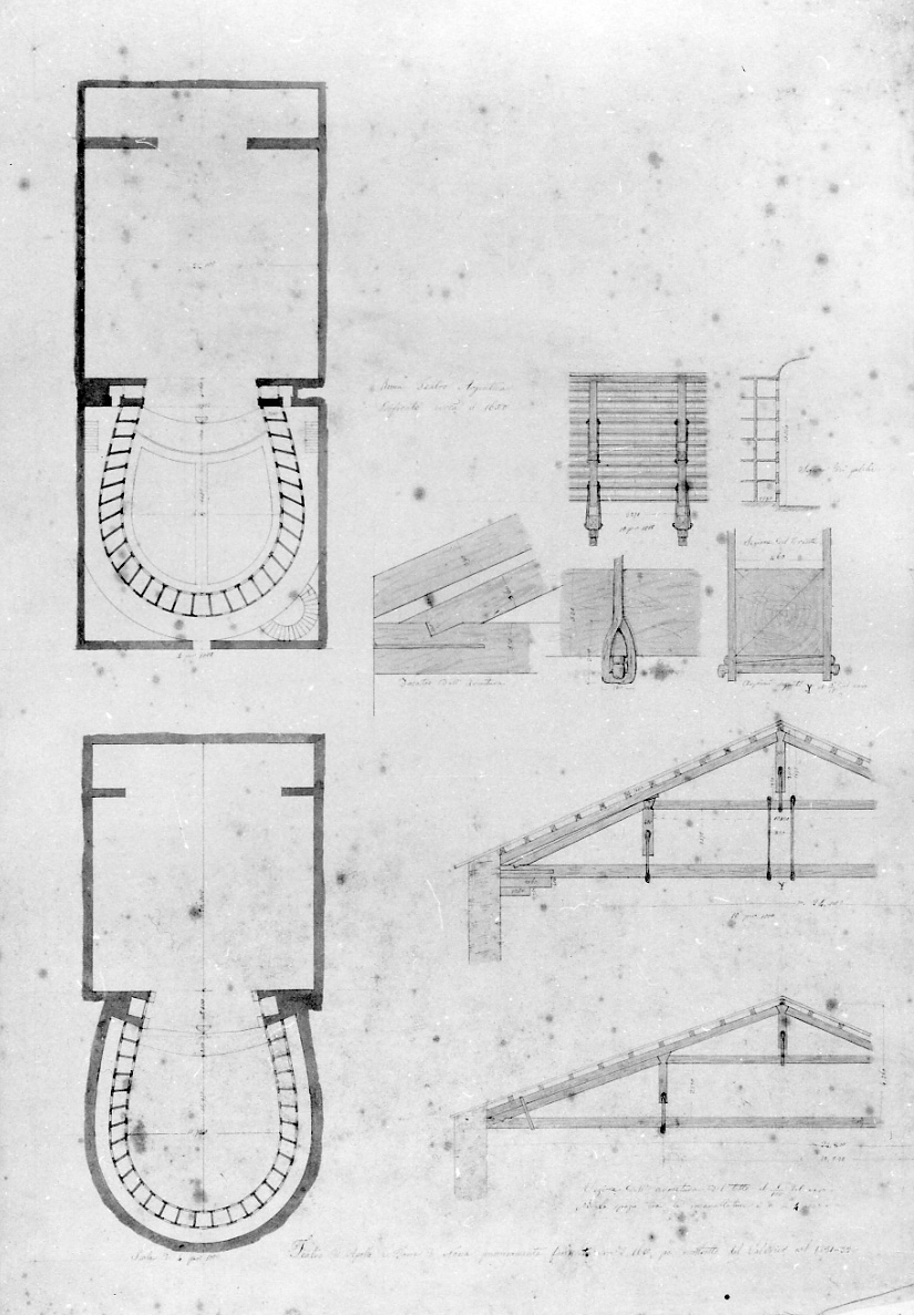 Il disegno raffigura le due piante e alcuni particolari dell'armatura del tetto, quotati