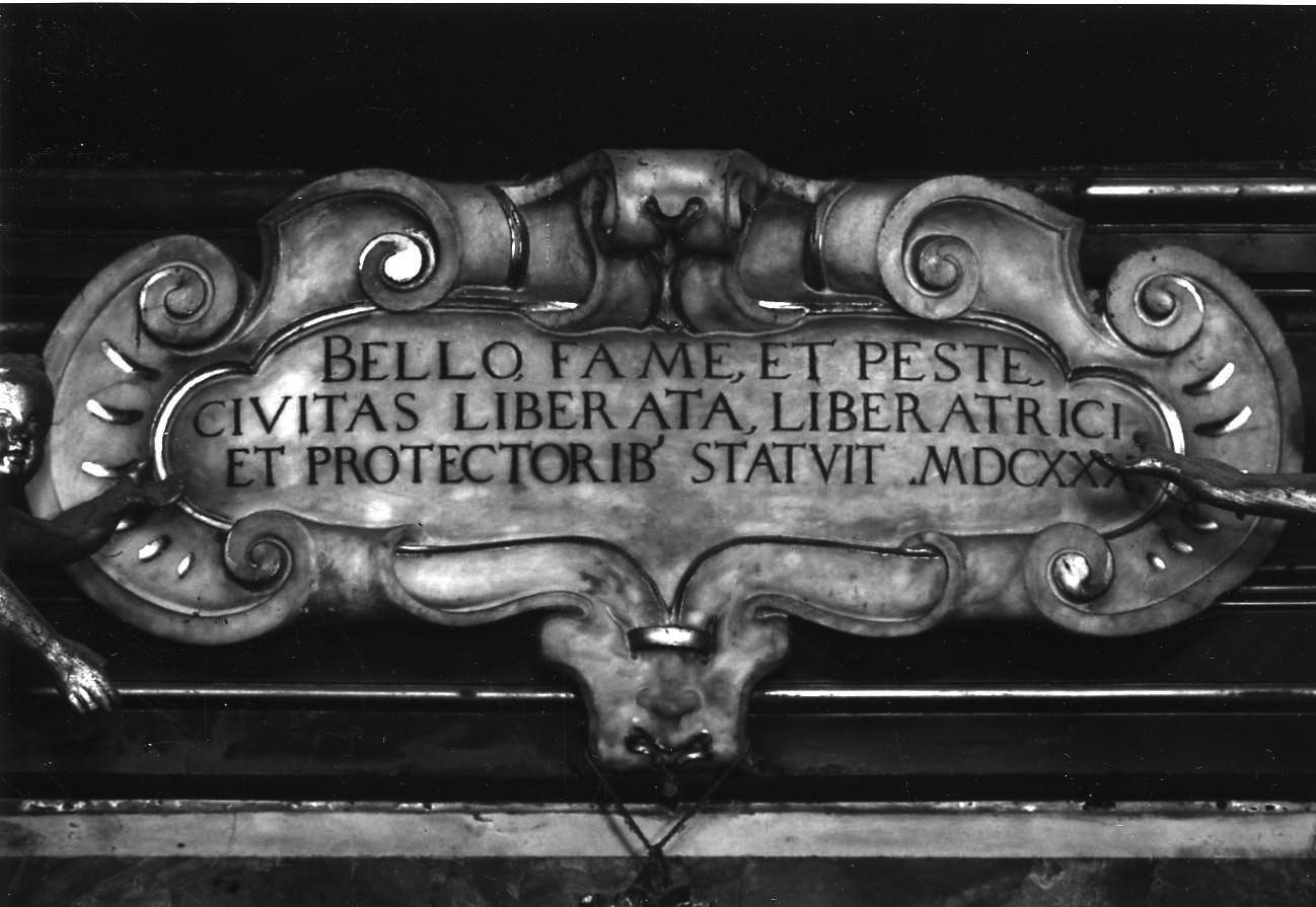 - ISCRIZIONI al centro - BELLO, FAME, ET PESTE,/ CIVITAS LIBERATA, LIBERATRICI,/ ET PROTECTORIBUS STATUIT MDCXXX - lettere capitali -