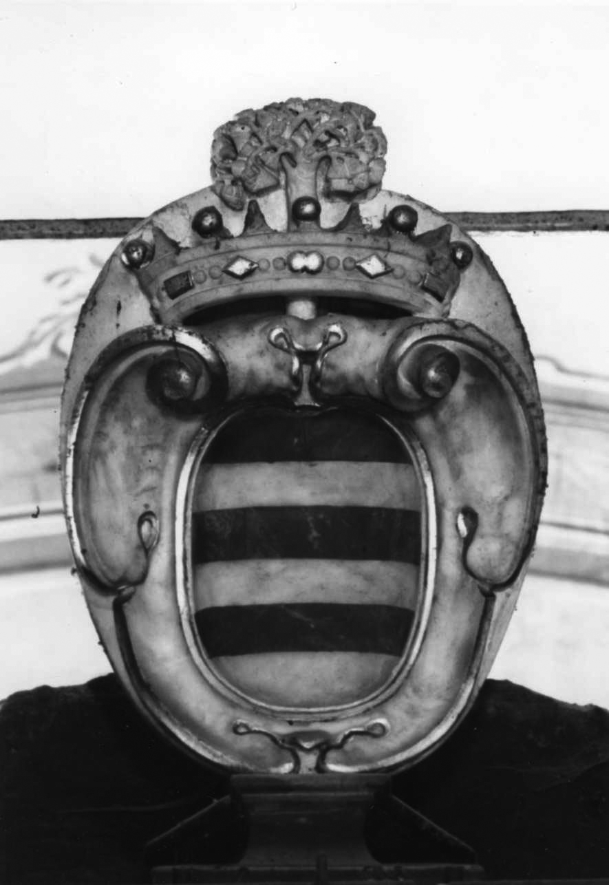 Decorazione plastica ovoidale con volute, contenente uno stemma dipinto