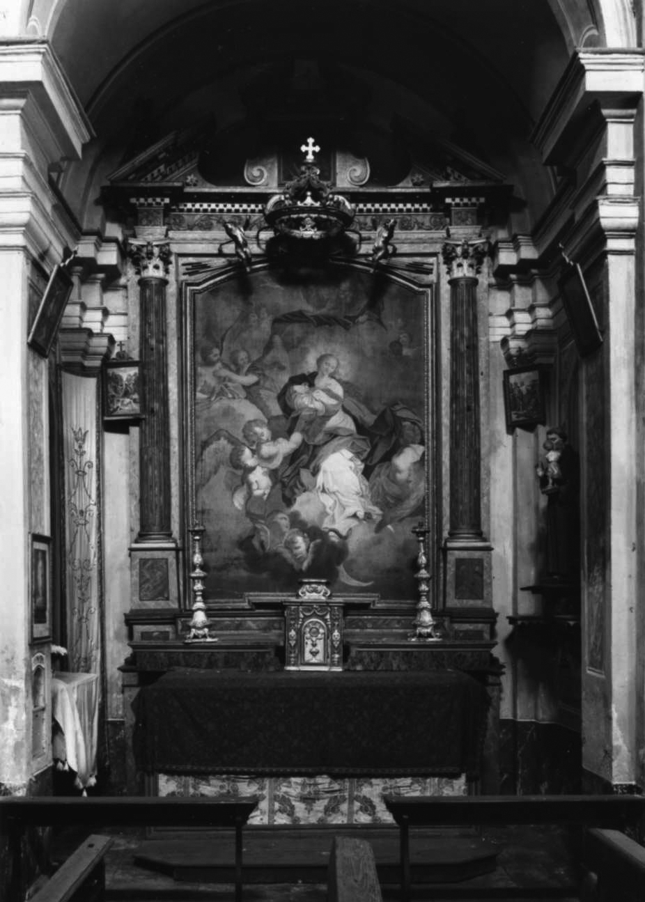 Incorniciatura architettonica su colonne lignee riquadranti una grande pala centinata sormontata da una corona e da due puttini. Colonne dipinte di verde ad effetto marmorizzato poggianti su un basamento cubico con pannello centralele decorativo dipinto di rosso con cornice nera. Base a doppia sezione circolare. Fusto con scanalature verticali e capitello composito colorato di giallo. Frontone con fascia decorata da un motivo di volute vegetali disposte a fascia simmetrica, intagliate a rilievo e dorate. Frontone spezzato con cornice dentellata e fastigio aggettante contenente un cartiglio sormontato da un secondo coronamento a timpano spezzato e aggettante. Cartiglio mistilineo con volute angolari contenente un dipinto rettangolare incorniciato da una cornice dorata