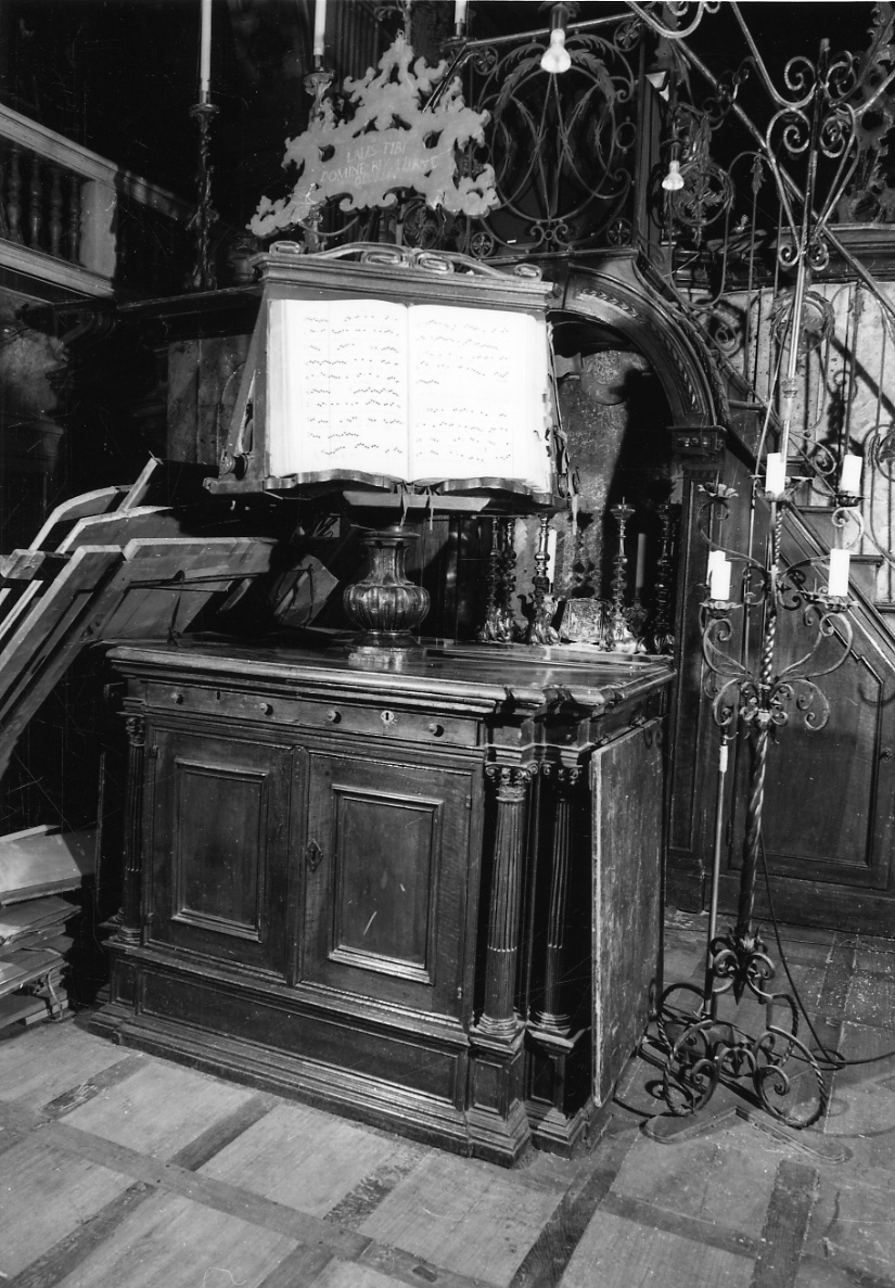 Il mobile di appoggio è di forma rettangolare e porta due ante, la soluzione degli angoli mostra un binaro di colonne corinzie rudentate, poste su alti basamenti. Il leggio, retto da un piedistallo a base circolare, bombate e lavorata a spicchi, è di pianta triangolare con decorazioni a doppia voluta alla sommità. L'elemento decorativo posto in cima è di aggiunta più tarda