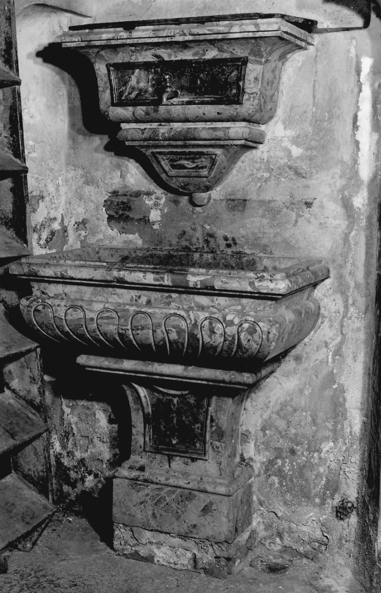 realizzato in marmo beige con venature marroni ed intarsi in altri marmi. Costituito di due parti indipendenti murate alla parete. Quella superiore ha la forma di una piramide rovesciata, con modanature sagomate cuevilinee, maschera il tubo di adduzione dell'acqua e presenta al centro un rubinetto in ottone. E'decorata da due cornici trapezoidali in marmo grigio con venature biance che chiudono due pannelli in marmo viola venato di bianco. Parte inferiore costituita da un piedistallo sagomato e modanato decorato in centro da un pannello in marmo viola venato di bianco con cornice in marmo grigio, che regge la vasca con cornice superiore rettangolare modanata e recipiente a profilo curvo decorato da incisioni a forma di petali