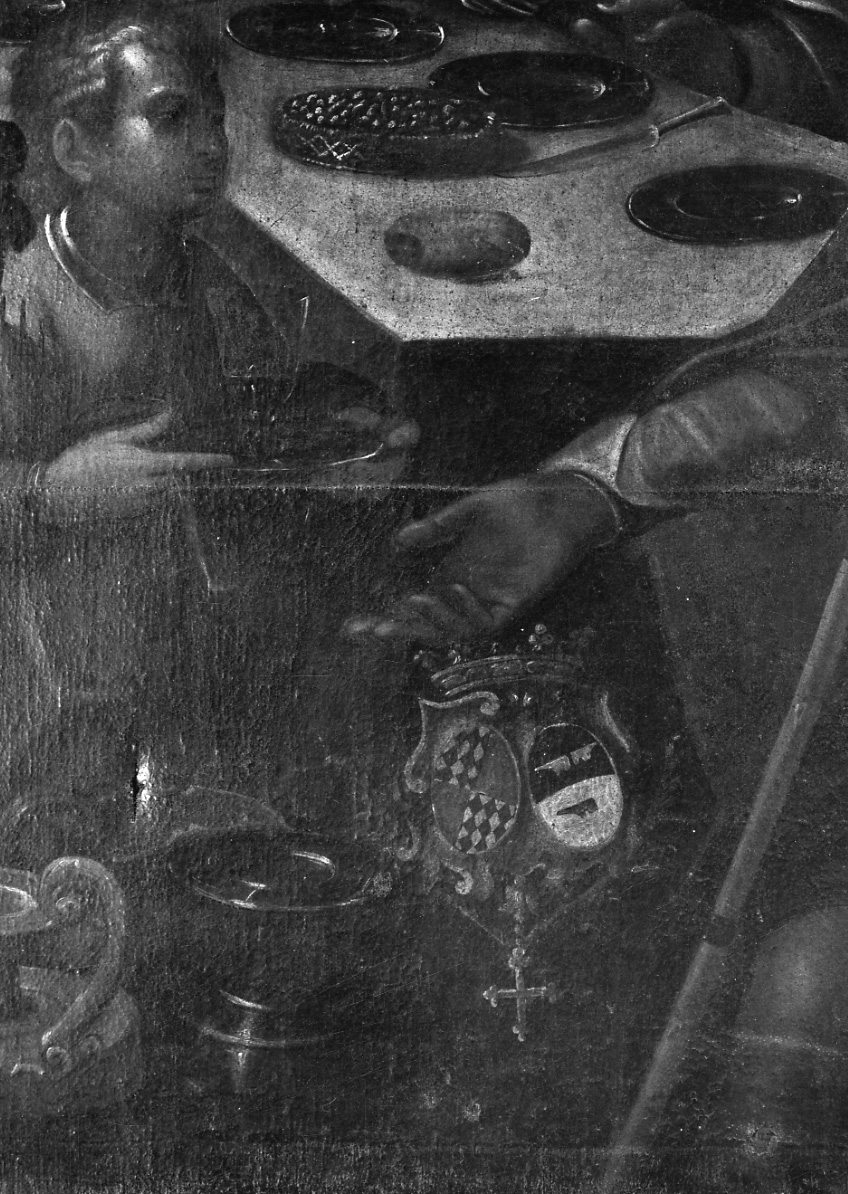 Ambiente: interno con lungo tavolo a cui siedono Gesù, al centro con veste rossa, accanto la Vergine; sulla destra due sposi con ricche vesti; sulla sinistra un gruppo di musici
