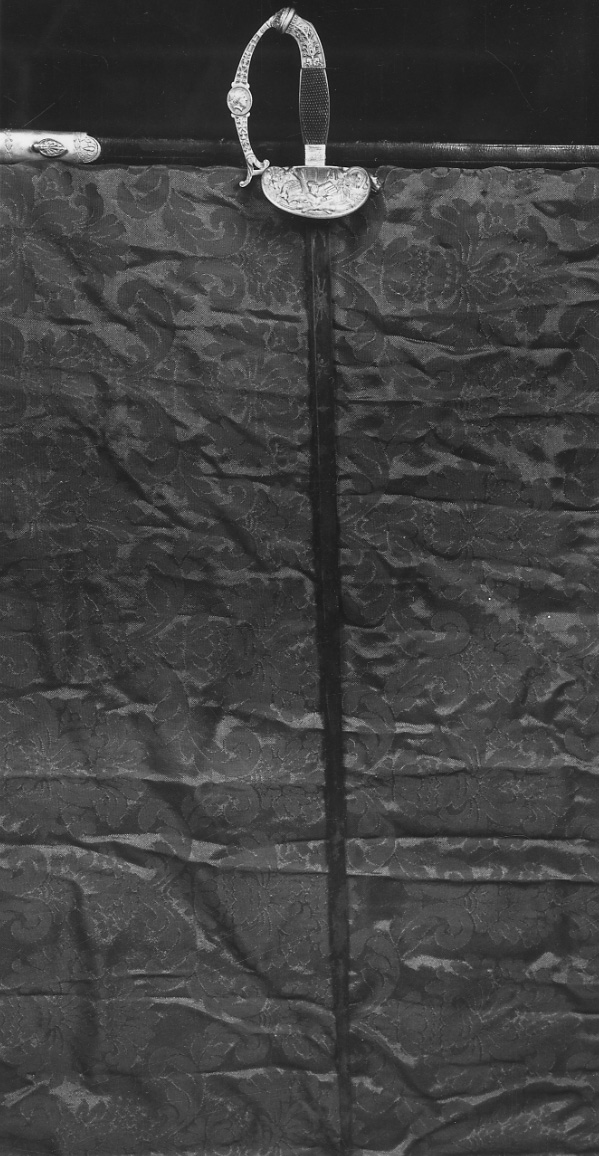 Lama: diritta e appuntata, a due fili con decorazione di lance, bandiere e motivi vegetali ageminata al forte. Fornimento: in bronzo dorato con coccia rettilinea terminante con testa leonina e scudo anteriore di profilo curvilineo con motivi allegorici incisi; guardia ad andamento arrotondato con motivi a grottesche e medaglione centrale con profilo incisi; impugnatura affusolata in osso con intagli trasversali incrociati e bronzo dorato con motivi a grottesche. Fodero: in cuoio nero con bordo e puntale in bronzo dorato