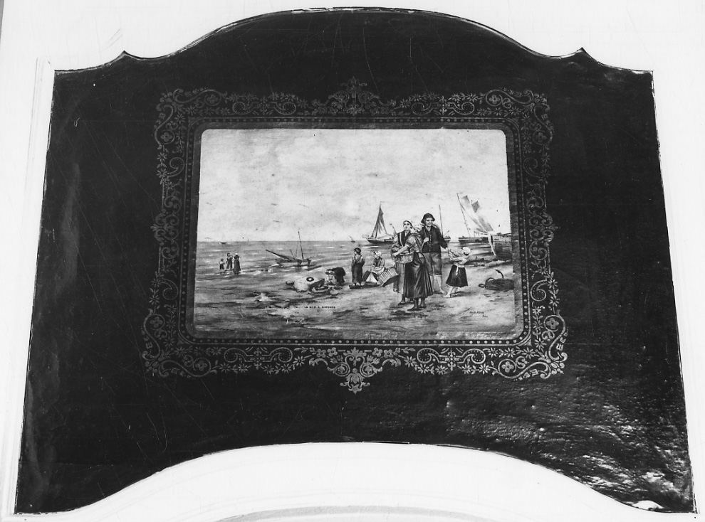 - NOTIZIE STORICO CRITICHE Nella stanza esistono due oggetti uguali, con titolo diverso (il mare di Bruges e il mare di Ostenda). Come è rilevabile dalla scritta posta in calce ai singoli riquadri si tratta di opere prodotte in Francia. È probabile che accanto alla produzione delle immaginette, attività assai fiorente a Parigi, si affiancasse anche una produzione di dipinti su carta di soggetto sia religioso che profano