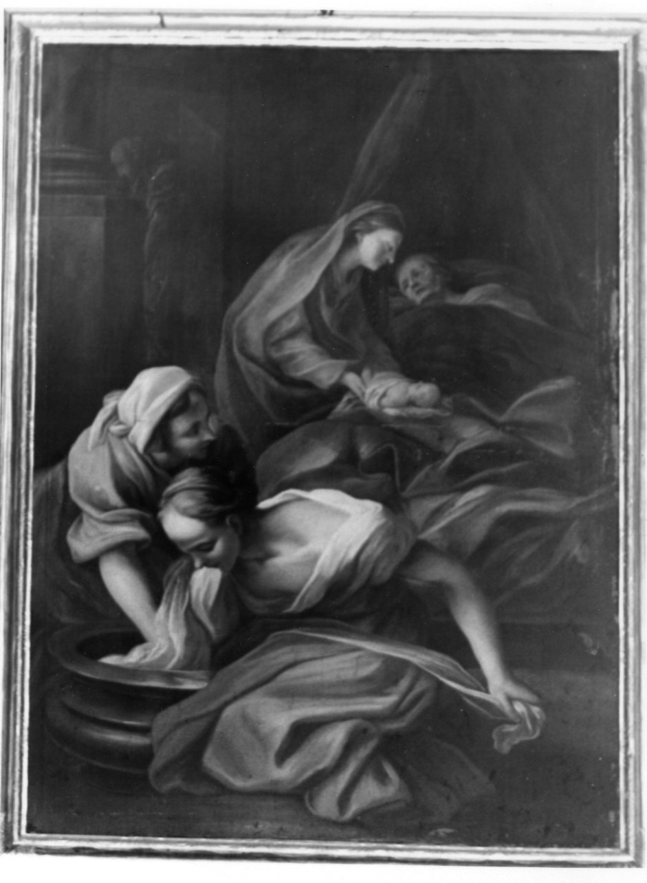 Due donne in primo piano sono chine sulla bacinella in atto di preparare il bagnetto per San Giovanni Battista, che compare come neonato sul letto accanto a Santa Elisabetta, giacente a letto prostrata dalla fatica. Sullo sfondo un'altra ancella e San Zaccaria