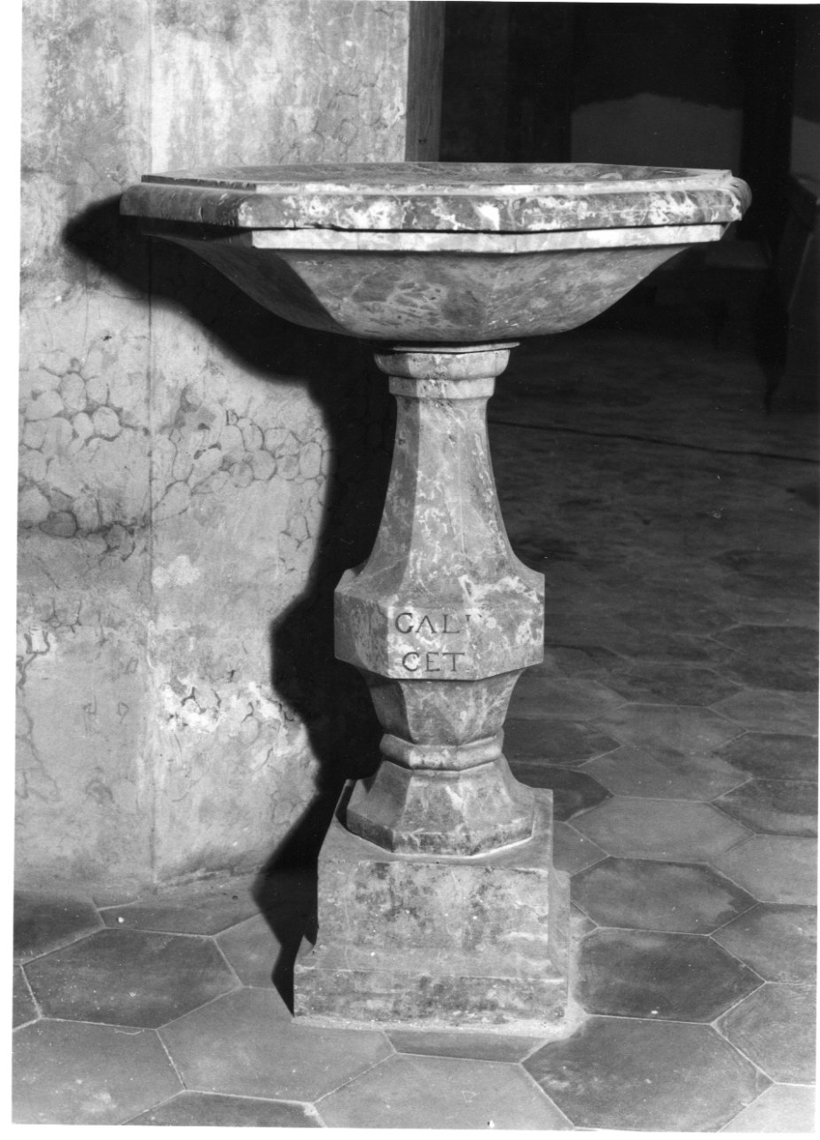 - NOTIZIE STORICO CRITICHE L'acquasantiera, riferibile al secondo Ottocento, è esemplata sull'altra acquasantiera settecentesca. Non è identificabile la scritta, forse riferibile alla famiglia donatrice