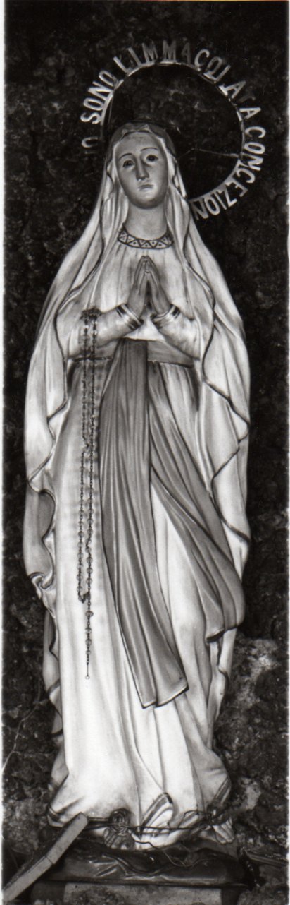 La Madonna è rappresentata con le mani giunte, vestita di bianco e con la cintura azzurra che le cinge la vita. Sul braccio destro è appoggiata la corona del rosario. La statua è situata al centro della ricostruzione della grotta di Lourdes che si trova sull' altare della navata