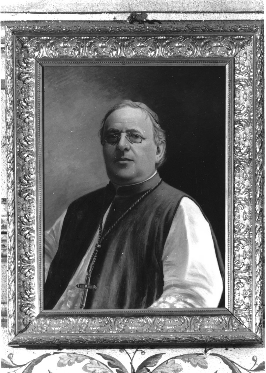 Ritratto a tre quarti di figura, il monsignore indossa vesti religiose, croce sul petto e occhiali