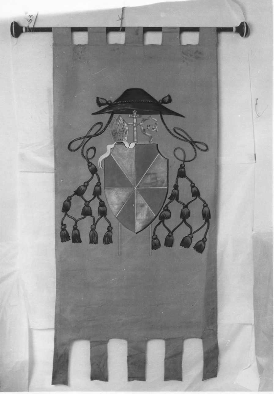 stendardo processionale costituito da un drappo di stoffa rettangolare di colore verde, teso su un'asta con orlo inferiore a code quadrangolari. al centro è raffigurato lo stemma arcivescovile di claudio seyssel