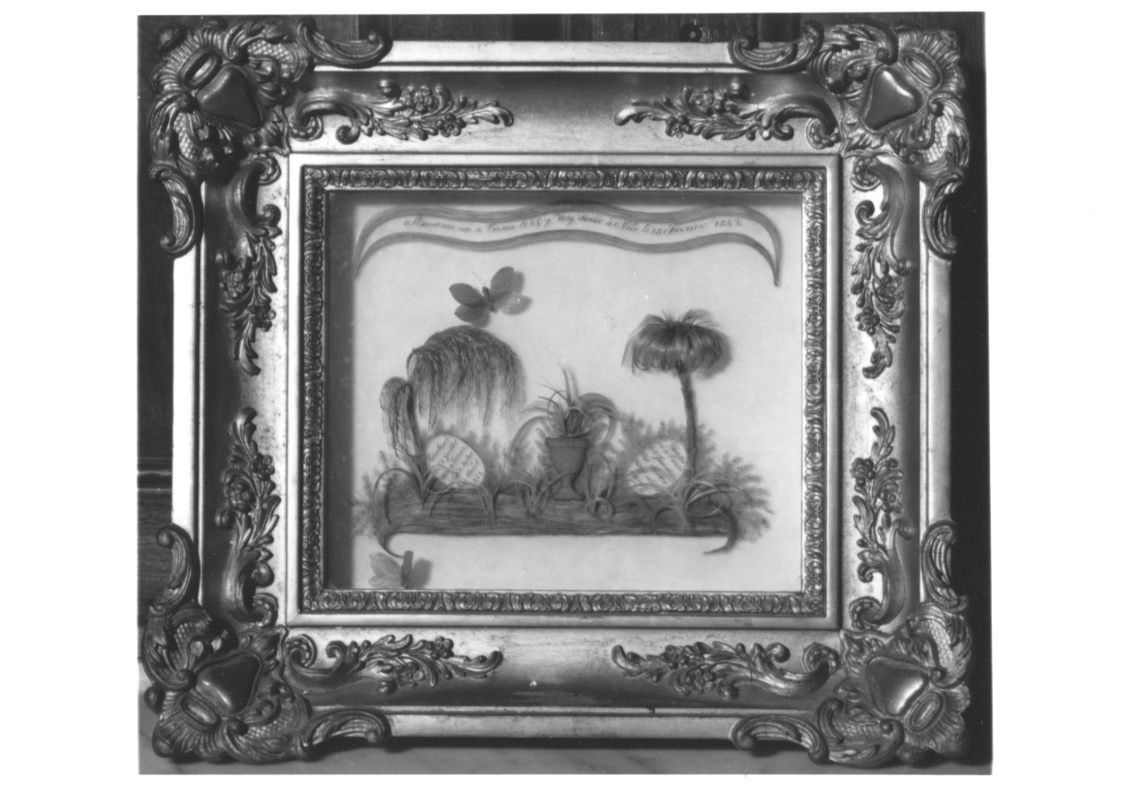 Composizione di capelli, su cartoncino, che simulano un paesaggio con alberi e un vaso centrale. Una farfalla vola sulla sinistra