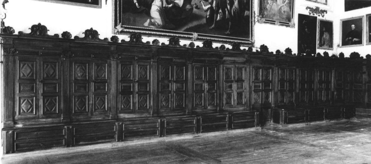 Il rivestimento è composto alla base da una doppia fila di cassetti che si congiungono alle ante degli armadi mediante lunghe ribaltine; sul secondo registro da doppie ante per gli armadi, caratterizzate da specchiature con motivi romboidali; infine da un fregio a volute affrontate