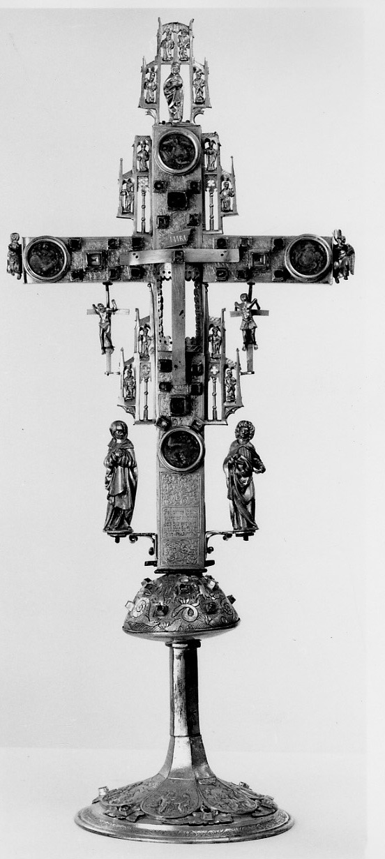 reliquiario topico costituito da piede circolare; fusto esagonale con nodo a mezza sfera; croce con teca cilindrica sul braccio maggiore. decorazione: sei medaglioni a rilievo, foglie, gemme sul piede; animali, piante, gemme sul nodo; girali vegetali, castoni con gemme, medaglioni circolari con i simboli degli evangelisti, elementi architettonici e diciannove statuette sulla croce (dodici apostoli e un santo vescovo entro edicole; madonna e san giovanni evangelista; i due ladroni lungo il braccio maggiore; due angeli con calice ai lati di quello minore); due scene ad incisione e una a rilievo sul retro della croce