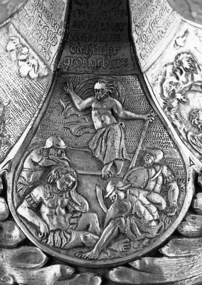 - ISCRIZIONI sul collo del piede - CHRIFTUC/ AUFTERFTA/ RIDENIBAR/ DABNAM/ DIE HUETER/ GROB GERARZ - caratteri gotici - a incisione - tedesco antico