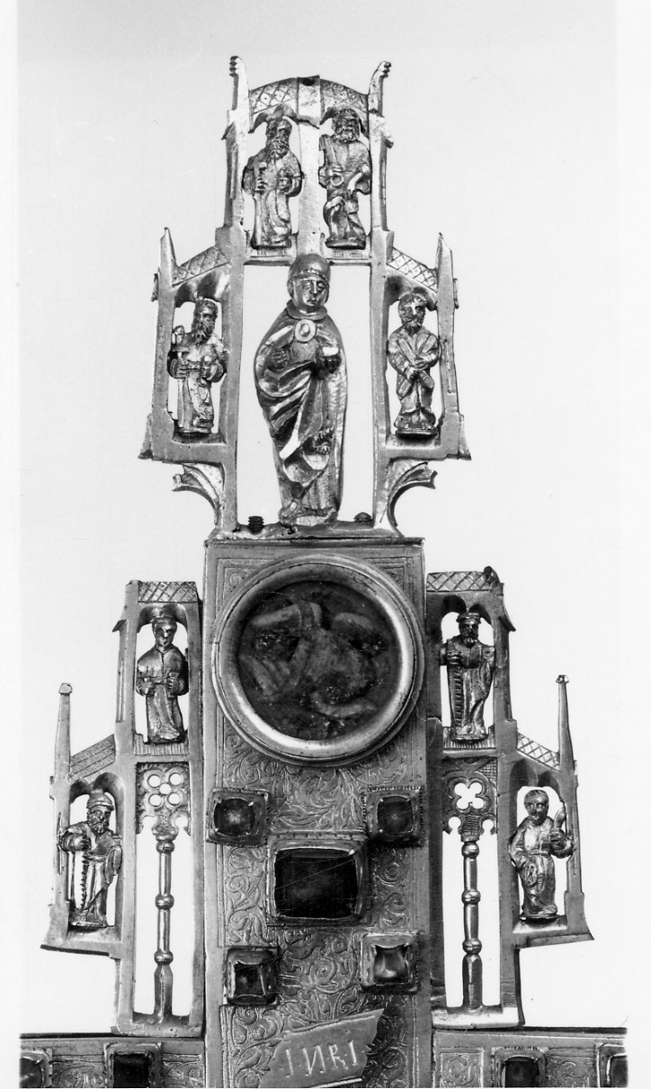 - NOTIZIE STORICO CRITICHE di provenienza ignota, fu inviato al Santuario con altri oggetti alla Esposizione d'Arte Antica a Torino nel 1880 (Carte inerenti l'invio di oggetti da parte del Santuario), segnalato nel Tesoro da Petrusi L./ Ratti C. (cfr. Guida Illustrata per villeggiante nel Biellese, 1900, p. 225), come croce per "la reliquia del legno della Croce", nel 1913 (cfr. F. Paschetto, Guida all'Esposizione del Tesoro, pp. 20-21), era sempre nel Tesoro, al centro della vetrina 8. Pubblicato come "arte tedesca dei secc. XV/ XVI" (cfr. D. Lebole, Il Santuario d'Oropa, 1996, v. I pp. 276-282, 400), il reliquiario è molto complesso e reca iscrizioni in tedesco. Stilisticamente pare accostarsi ad esempi di area tedesca, databili attorno al 1470-1490. (cfr. Trompetto M. Storia del Santuario di Oropa, 1978, p. 515), e (cfr. Bergamini G. a cura Ori e Tesori d'Europa, 1992, pp. 90-91, 94, 179)