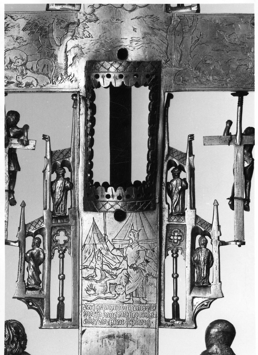 - NOTIZIE STORICO CRITICHE di provenienza ignota, fu inviato al Santuario con altri oggetti alla Esposizione d'Arte Antica a Torino nel 1880 (Carte inerenti l'invio di oggetti da parte del Santuario), segnalato nel Tesoro da Petrusi L./ Ratti C. (cfr. Guida Illustrata per villeggiante nel Biellese, 1900, p. 225), come croce per "la reliquia del legno della Croce", nel 1913 (cfr. F. Paschetto, Guida all'Esposizione del Tesoro, pp. 20-21), era sempre nel Tesoro, al centro della vetrina 8. Pubblicato come "arte tedesca dei secc. XV/ XVI" (cfr. D. Lebole, Il Santuario d'Oropa, 1996, v. I pp. 276-282, 400), il reliquiario è molto complesso e reca iscrizioni in tedesco. Stilisticamente pare accostarsi ad esempi di area tedesca, databili attorno al 1470-1490. (cfr. Trompetto M. Storia del Santuario di Oropa, 1978, p. 515), e (cfr. Bergamini G. a cura Ori e Tesori d'Europa, 1992, pp. 90-91, 94, 179)