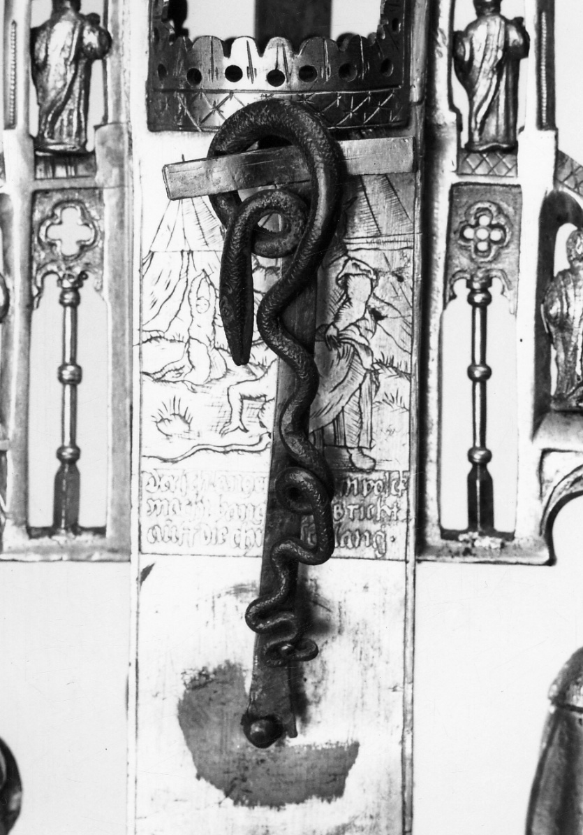 scultura raffigurante il demonio tentatore sotto forma di serpente di bronzo