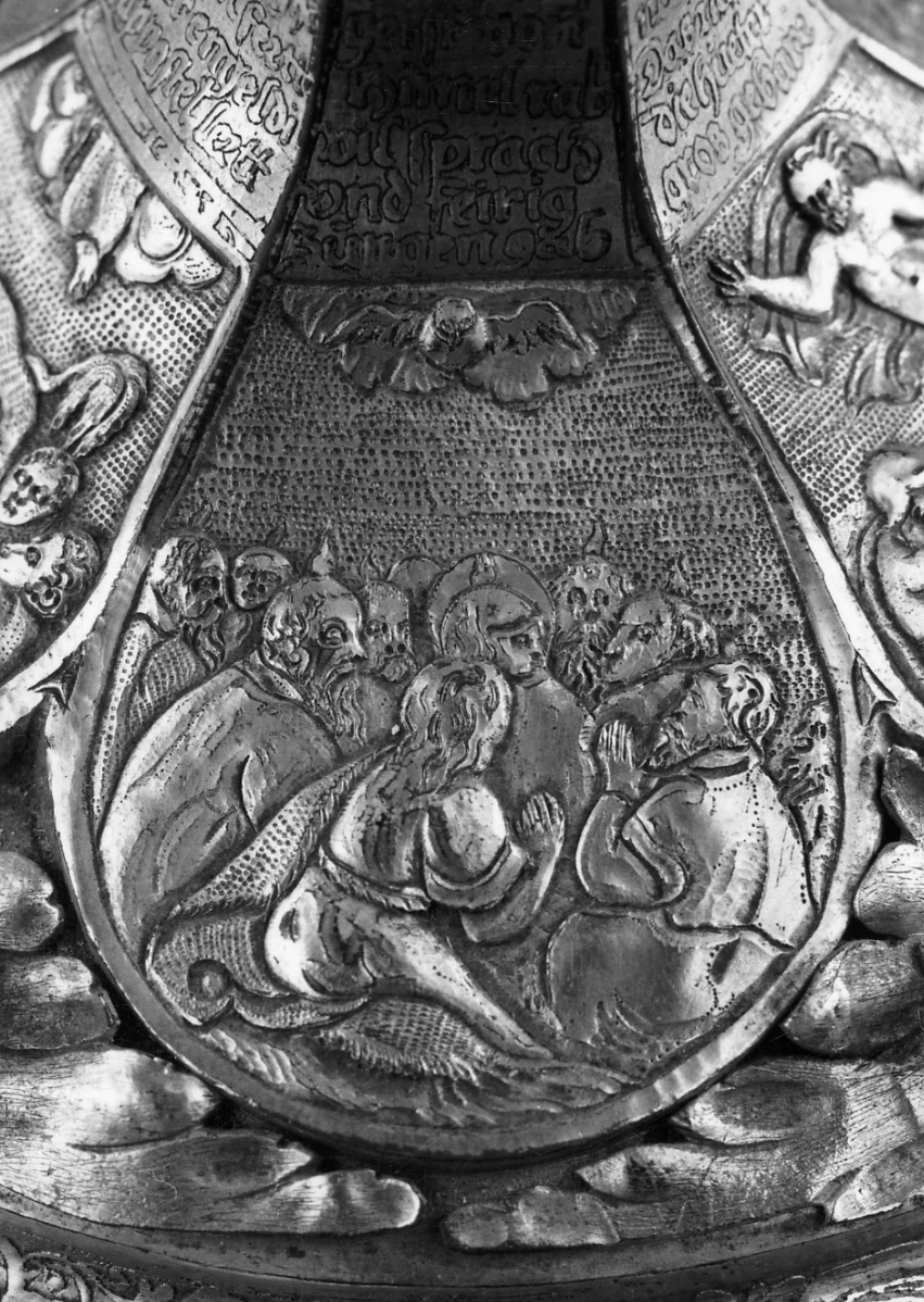 - ISCRIZIONI sul collo del piede - DAR HEILIA/ GEIFT DORT/ HIMELRAB/ DIL FPRACH/ OND FEIRIG/ ZUNGERGAB - caratteri gotici - a incisione - tedesco antico