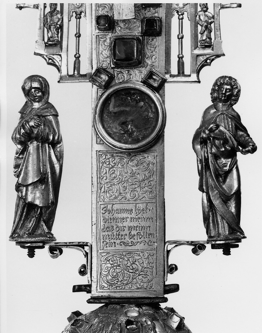 - NOTIZIE STORICO CRITICHE di provenienza ignota, fu inviato al Santuario con altri oggetti alla Esposizione d'Arte Antica a Torino nel 1880 (Carte inerenti l'invio di oggetti da parte del Santuario), segnalato nel Tesoro da Petrusi L./ Ratti C. (cfr. Guida Illustrata per villeggiante nel Biellese, 1900, p. 225), come croce per "la reliquia del legno della Croce", nel 1913 (cfr. F. Paschetto, Guida all'Esposizione del Tesoro, pp. 20-21), era sempre nel Tesoro, al centro della vetrina 8. Pubblicato come "arte tedesca dei secc. XV/ XVI" (cfr. D. Lebole, Il Santuario d'Oropa, 1996, v. I pp. 276-282, 400), il reliquiario è molto complesso e reca iscrizioni in tedesco. Stilisticamente pare accostarsi ad esempi di area tedesca, databili attorno al 1470-1490. (cfr. Trompetto M. Storia del Santuario di Oropa, 1978, p. 515), e (cfr. Bergamini G. a cura Ori e Tesori d'Europa, 1992, pp. 90-91, 94, 179)