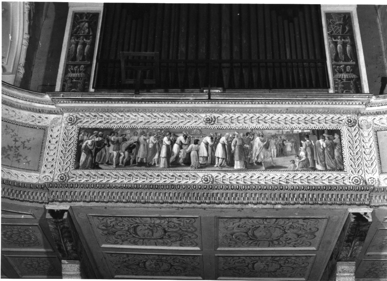 La cantoria ha una forma semicircolare. La parte interna è scandita da sette pannelli dipinti intercalati da una greca ad incastro. I pannelli rappresentano il Trasporto dell'Arca, angeli musicanti e strumenti musicali. Le due parti esterne sono costituite rispettivamente da due pannelli e da quattro pannelli, raffiguranti angeli musicanti e strumenti musicali. La parte inferiore è scandita da pannelli rettangolari con al centro un angelo musicante e intorno elementi a volute