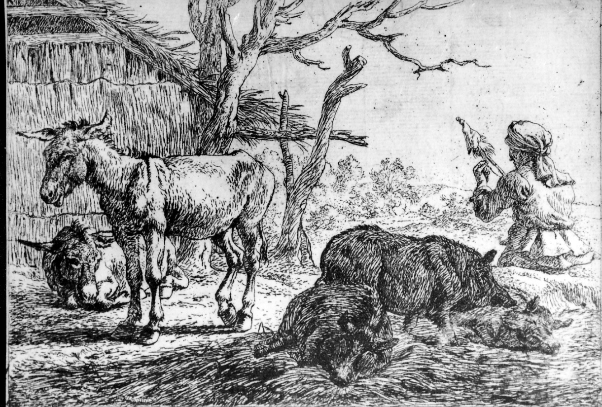Figure: figura femminile. Animali: asini; maiali. Costruzioni: stalla