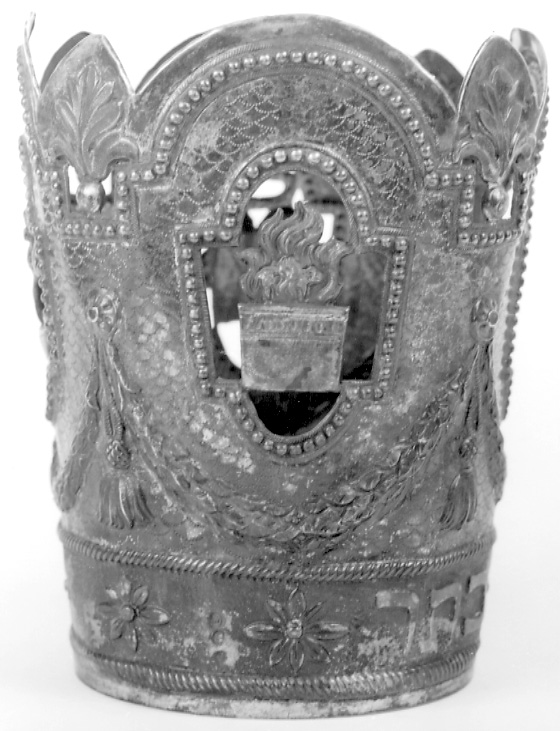 Coppia di corone di forma rastremata verso il basso. Circolo di base a fondo granito con iscrizione ebraica fra cornici cordonate. Fastigio con festoni e fiori su fondo a squame e simboli del Tempio entro cornice perlinata