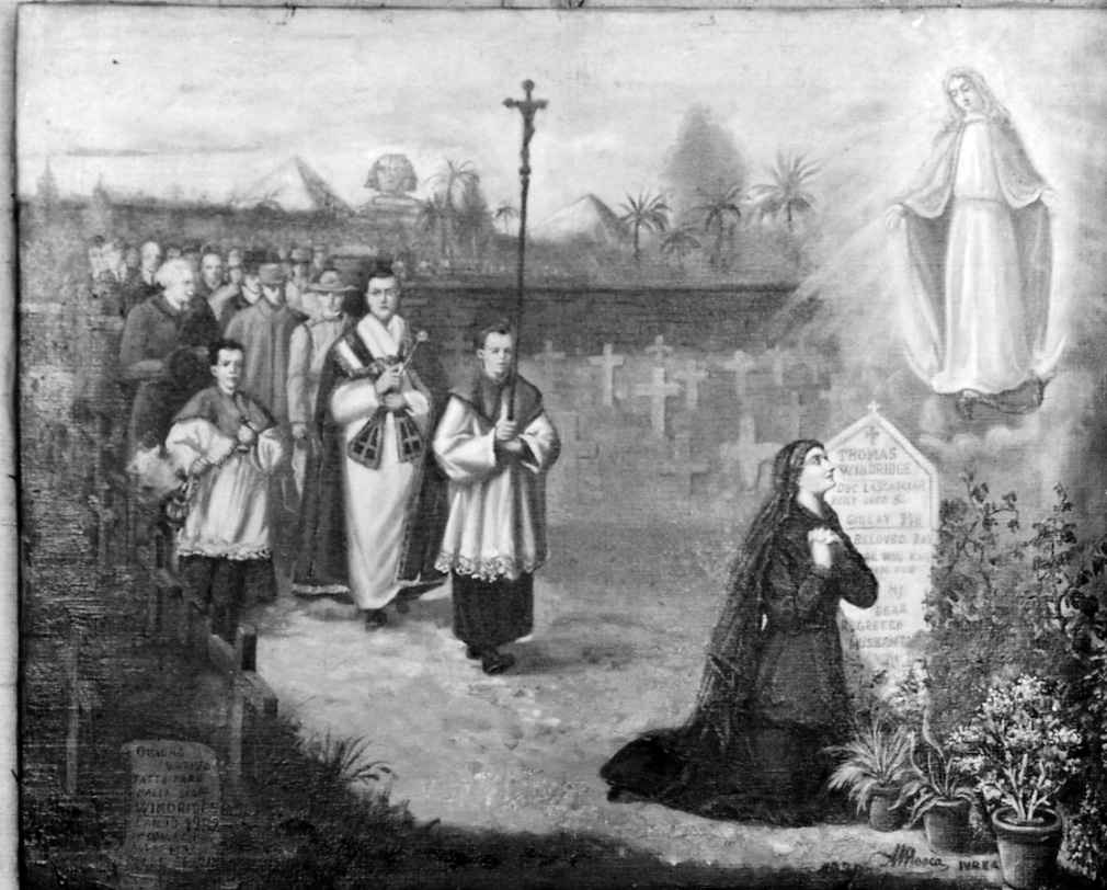 - ISCRIZIONI in basso a sinistra, su cartiglio - QUADRO VOTIVO FATTO FARE DALLA SIG.RA WINDRIDGE L'ANNO 1932 IN OMAGGIO ALLA B.V. DELLE GRAZIE - corsivo -