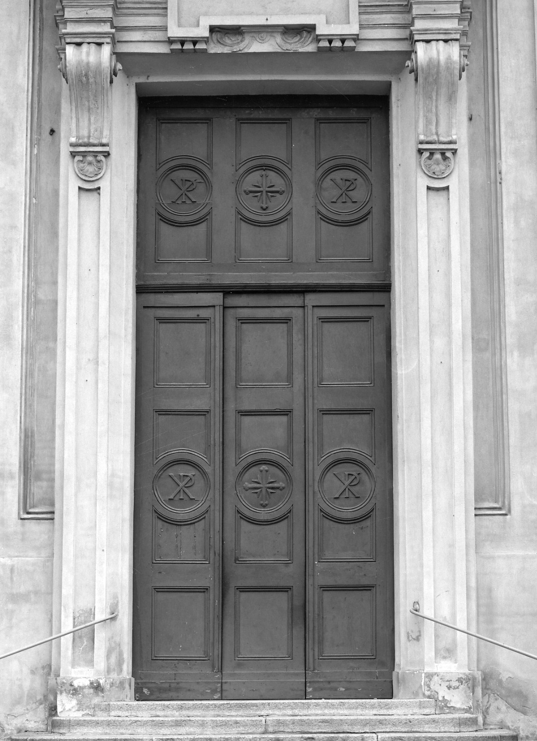 Portone a tre battenti compartito ognuno da tre pannelli rettangolari. Quelli centrali sono ornati da cornici circolari in rilievo recanti il monogramma cristologico nei battenti laterali e la croce dell'Ordine Mauriziano nel battente in mezzo. I tre tondi sono ripetuti nella parte superiore al portone. Il portone è provvisto di cardini e chiavistelli di notevoli dimensioni