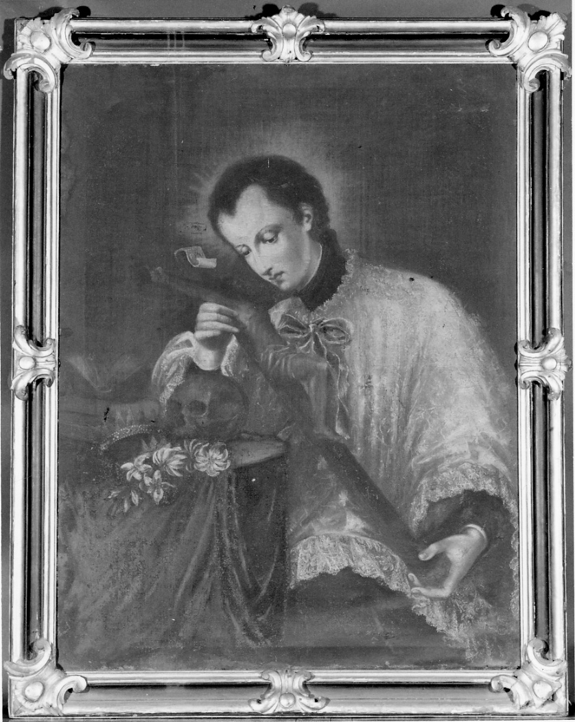 Cornice con motivo a foglie d'acanto stilizzate, fra le quali è inserito un piccolo medaglione, sugli angoli e a metà dei lati. La cornce inquadra il dipinto di un diacono (?) recante un crocifisso in mano